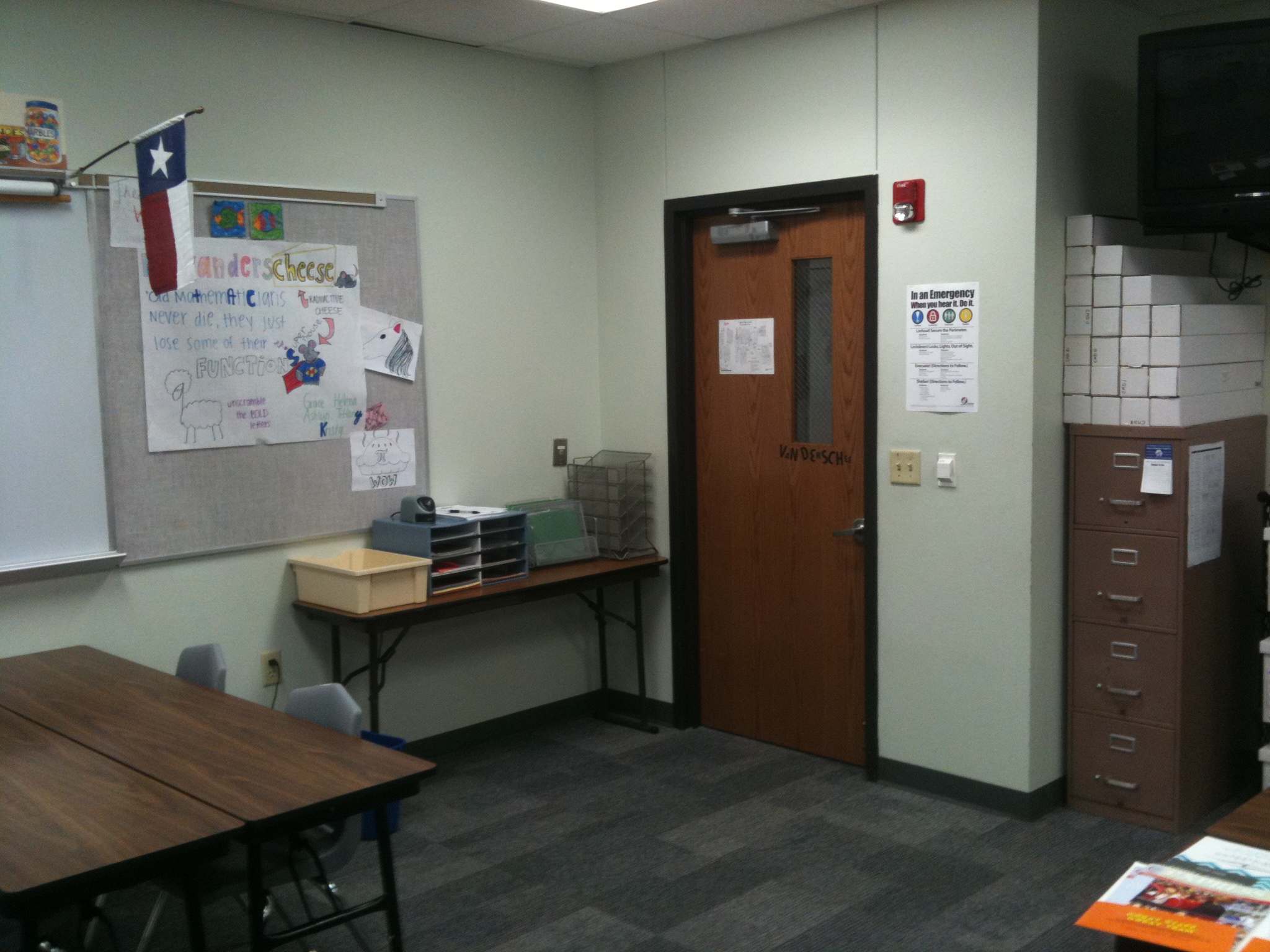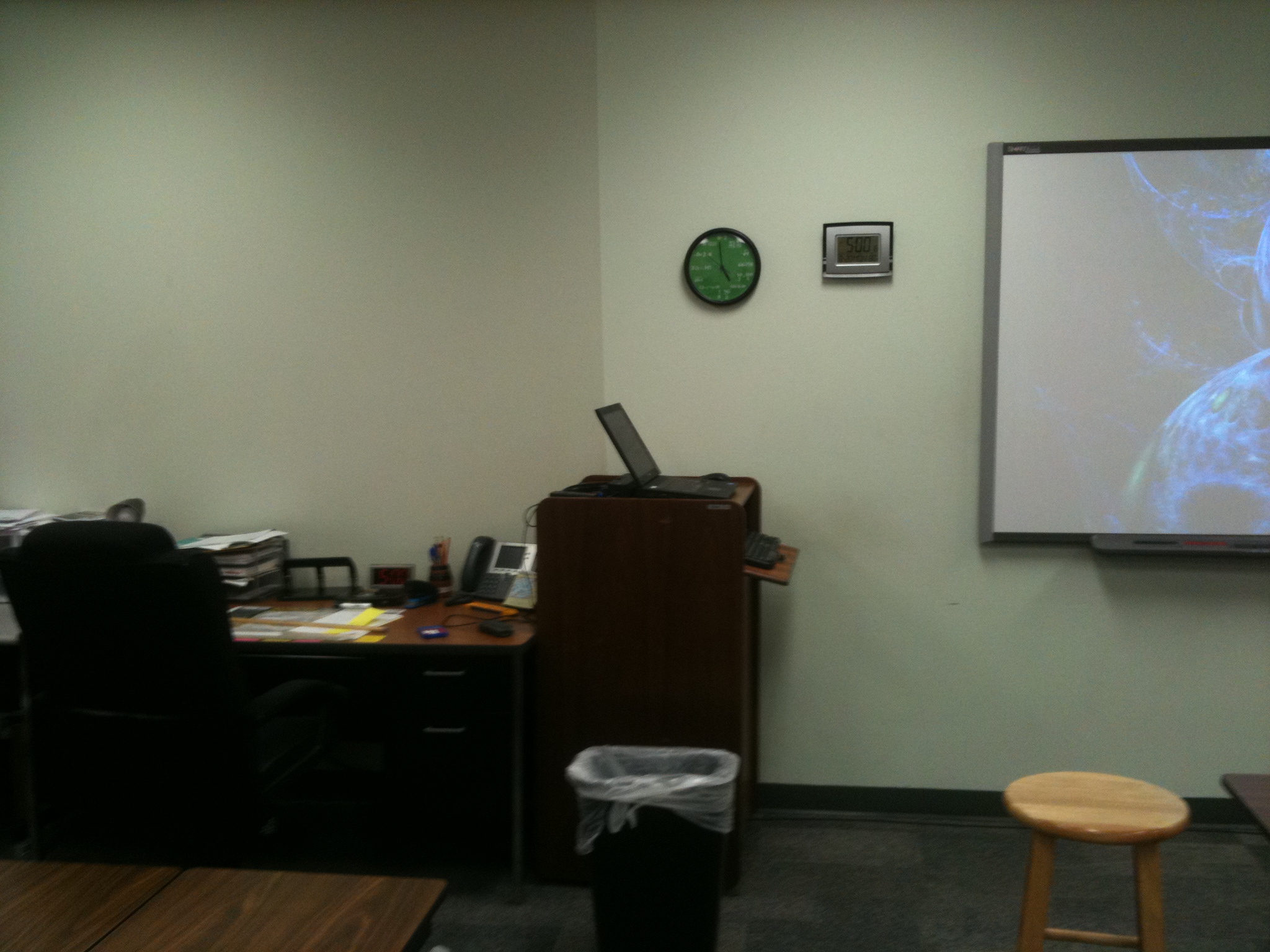 My teacher’s desk is pushed against the wall to remove that student/teacher barrier. Now I can go to the students instead of them coming to me.