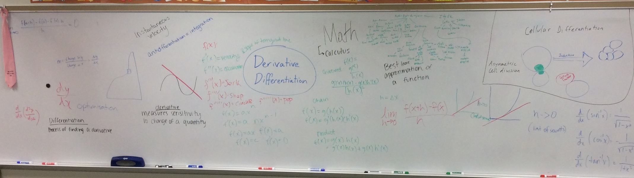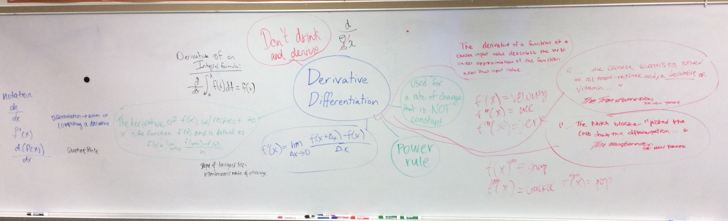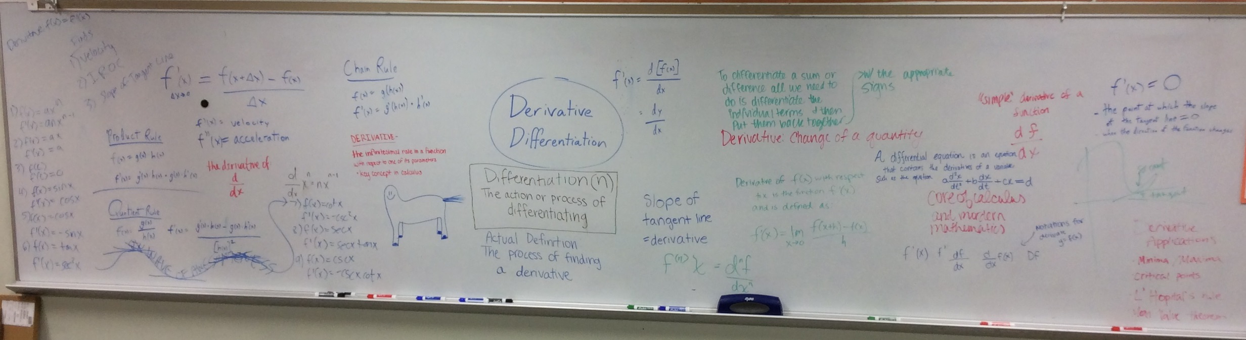 For the first time this year, I employed my idea of an Overview Day. We are about to begin our first unit on Derivatives, so I wrote the words “Derivative” and “Differentiation” on the board with a circle around it. It was their job to research these terms, and add any important words, phrases, formulas, or pictures to the board. When they finished, we had a very nice summary of the entire chapter that THEY created! I went through and explained how each part was relevant to derivatives, and how they would be used. This way, when they see these words, phrases, etc., again, it will reinforce today’s discussion. Here are the results of their research: