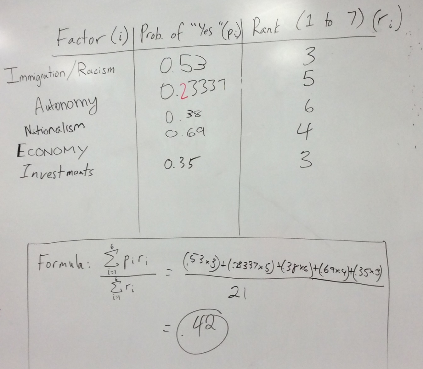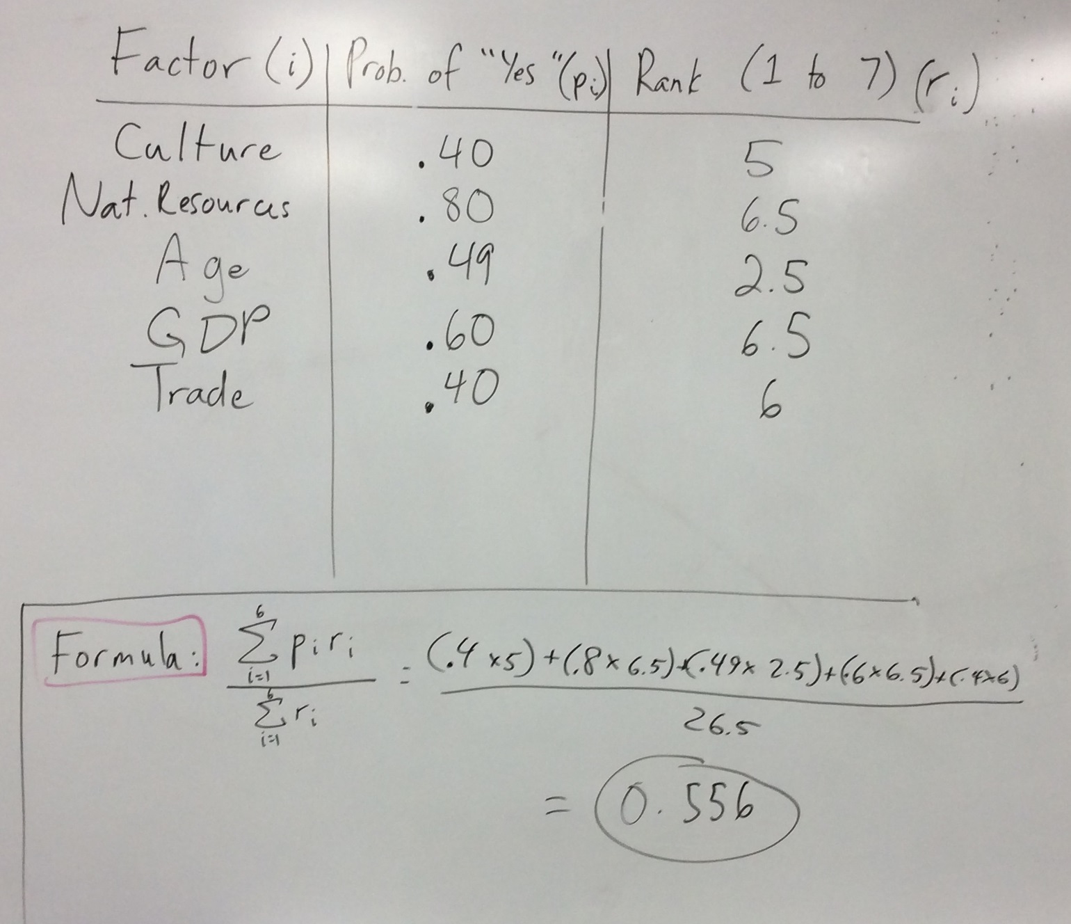Here’s where the math came in. Using a formula that is similar to the formula for expected value, we multiplied each probability by the respective ranking, added it all up, and divided by the sum of the rankings.