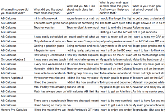 I used this survey for a few years, and this year, I decided to make my own. I asked a lot of the same questions, but added some new ones: what is your main goal for math class this year, and what is your greatest obstacle in math class. I send out the survey as a Google Form and use a spreadsheet to track the results.